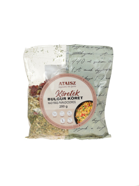 Hagymás-paradicsomos bulgur köret. Tojás-, tej-, GMO-mentes termék, nulla sóval.
