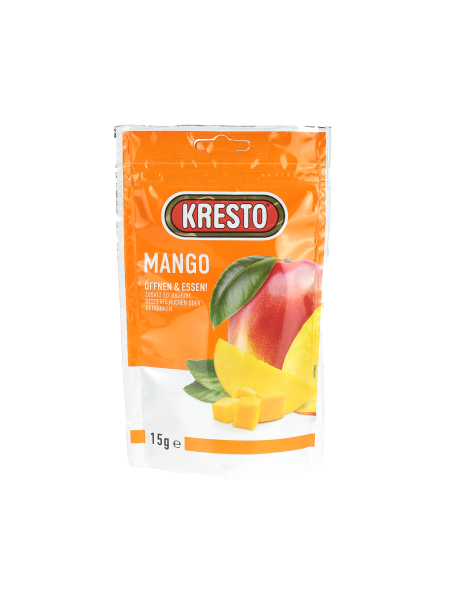 Liofilizált (fagyasztva szárított) mangódarabok (0.7 kg friss mangóból).