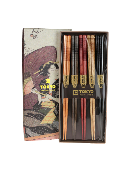 5 pár japán stílusú, bevésett gyűrűkkel díszített, festett, elvékonyodó végű fa evőpálca - tradicionális ruhába öltözött japán nőt ábrázoló díszdobozban. Az evőpálcák különböző színűek: narancsos-barna, földbarna, piros, natúr faszín, sötétbarna.