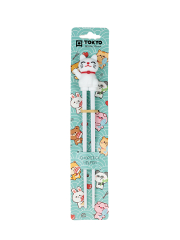 1 pár, szögletes, fehér melamin tanuló evőpálca gyerekeknek, elvékonyodó csúccsal, fehér integető macskával a tetején.