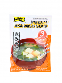 3 tasak (adag) tartósítószermentes aka/vörös instant miso levespor: miso porral, szárított wakame algával, újhagymával és tofuval. A vörös miso erőteljesebb ízvilágú, a belőle készült leves is karakteresebb lesz.