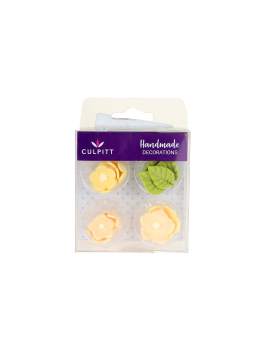 színes virágok: cukor, kukoricakeményítő, tojásfehérje, színezék: E133, E122*, E129*, E102*