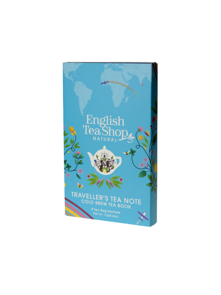 Utazó, hideg áztatűsú bio teaválogatás, kis könyvbe csomagolt 8 teafilterrel: 4 filter szuperbogyó herba-rooibos tea és 4 filter kókusz-maracuja fehér tea.