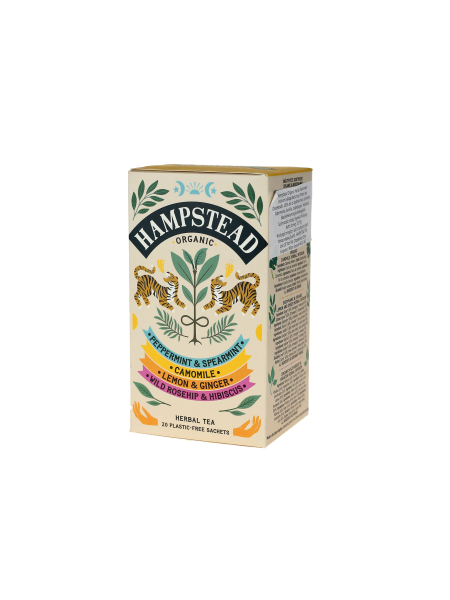 Bio herbatea-válogatás: bio mentatea (5 db fehérítetlen, műanyagmentes, komposztálható teafilter), bio kamillatea (5 db fehérítetlen, műanyagmentes, komposztálható teafilter), bio citrom-gyömbér herbatea (5 db fehérítetlen, műanyagmentes, komposztálható teafilter), bio csipkebogyó-hibiszkusz tea (5 db fehérítetlen, műanyagmentes, komposztálható teafilter).