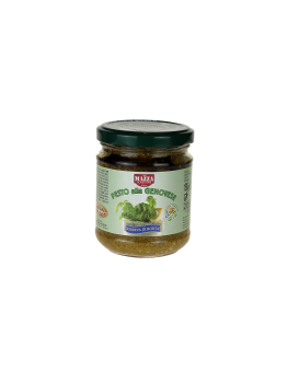friss bazsalikom, extra szűz olívaolaj, kesudió, Grana Padano sajt (tehéntej, só, tejoltó - tojásból készült lizozimot tartalmaz), pecorino sajt, burgonyakeményítő, napraforgóolaj, fenyőmag, só, cukor, fokhagyma, savanyúságot szabályozó anyag: E330