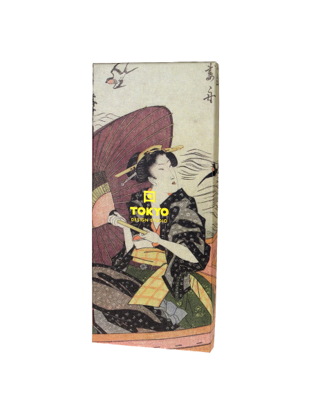 5 pár japán stílusú, bevésett gyűrűkkel díszített, festett, elvékonyodó végű fa evőpálca - tradicionális ruhába öltözött japán nőt ábrázoló díszdobozban. Az evőpálcák különböző színűek: narancsos-barna, földbarna, piros, natúr faszín, sötétbarna.