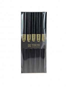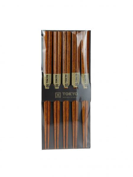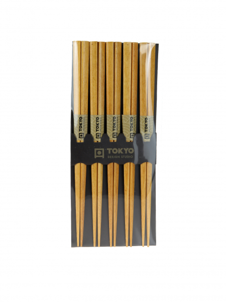 5 pár japán stílusú, háromszögletű, festett fa evőpálca, elvékonyodó csúccsal. 3 különböző színben kapható: natúr világosbarna, barna és fekete.