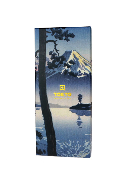 Japán stílusú, csapott végű (tensoge alakú), barnára festett fa evőpálca szett (5 pár) - Fuji hegyet ábrázoló díszdobozban. Az evőpálcák csapott végein más-más Fuji hegy ábrázolás van.