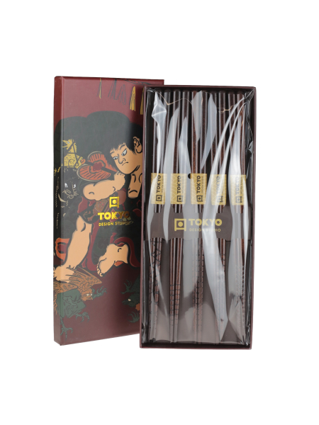 Japán stílusú, barna színűre lakkozott, Castanopsis cuspidata fából készült evőpálca szett (5 pár), bordázott csúccsal - Ukiyoe (a 17. és 19. század között felvirágzó japán művészeti stílus) díszdobozban.