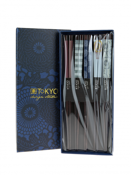 5 pár japán stílusú, színes motívumokkal díszített, barnára festett bambuszból készült, elvékonyodó végű evőpálca - díszdobozban.