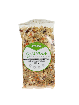 lencse és vöröslencse 62%, szárított zöldségek (sárgarépa, paszternák), vöröshagyma, paradicsom