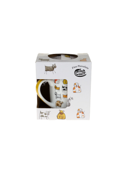Kétféle mintás (cicás + kutyás) porcelán teásbögre fémszűrővel és tetővel, cicás-kutyás karton díszdobozban.